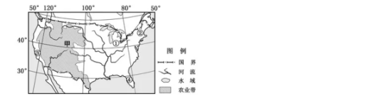 下图为美国本土部分地理要素分布示意图。完成12、13题。