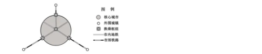 市郊铁路是连接核心城市与外围城镇的快速、便捷、公交化铁路。下图为我国某地市郊铁路与市内地铁分布模式图。完成14、15题。