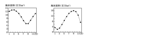 下图为两极地区多年平均海冰面积年内变化图。完成第23题。