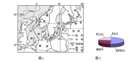 材料:西欧是世界上重要的天然气输入地区。图1为欧洲部分地区略图。德国是天然气进口大国,92%的天然气需要从国外进口。图2为2017年德国天然气进口来源构成图。目前,俄罗斯、德国等国家在图1中甲乙两地间新建天然气输气管道。
