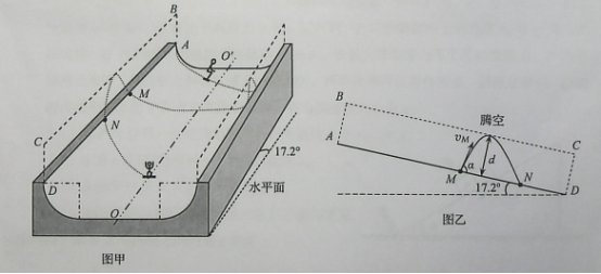 16.(9分)单板滑雪U型池比赛是冬奥会比赛项目,其场地可以简化为如图甲所示的模型: U形滑道由两个半径相同的四分之一圆柱面轨道和一个中央的平面直轨道连接而成,轨道倾角为17.2°。某次练习过程中,运动员以vM=10 m/s的速度从轨道边缘上的M点沿轨道的竖直切面ABCD滑出轨道,速度方向与轨道边缘线AD的夹角α=72.8°,腾空后沿轨道边缘的N点进入轨道。图乙为腾空过程左视图。该运动员可视为质点,不计空气阻力,取重力加速度的大小g=10 m/s2, sin72.8°=0.96,cos72.8°=0.30。求: