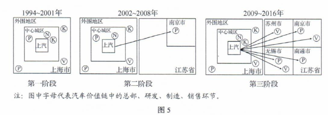 改革开放以来,我国汽车产业政策不断调整,汽车产业得到了快速发展。上汽集团成立于1984年,是国内最早的汽车集团之一。1994~2016年,上汽集团的扩张经历了“本地多样化—初步的市外扩张—以市外扩张为主”三个阶段。其中,第一阶段在上海市建成了完备的汽车生产及配套体系,第二、三阶段向江苏等地扩张(图5)。据此完成11~12题。