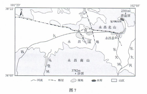 河西走廊西大河流域的永昌盆地介于永昌南山与永昌北山之间(图7),海拔1875~2106m,地势自西南向东北倾斜。盆地内分布有若干块湿地,这些湿地的形成是地形、地质条件及地表水、地下水共同作用的结果。金川峡水库位于盆地最低处,是当地生产和生活的重要水源地。