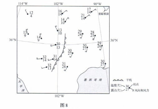 露点是空气因冷却而达到饱和时的温度,其数值越大,反映空气中水汽含量越大。一般情况下,温度相同时湿空气要比干空气密度小。两个温度相近的干、湿气团相遇所形成的锋,称为干线。图8为北美洲部分地区某时刻主要气象要素分布形势示意图,来自极地、太平洋和墨西哥湾的三种性质不同的气团,在落基山以东平原地区交绥形成三个锋:冷锋、暖锋和干线。