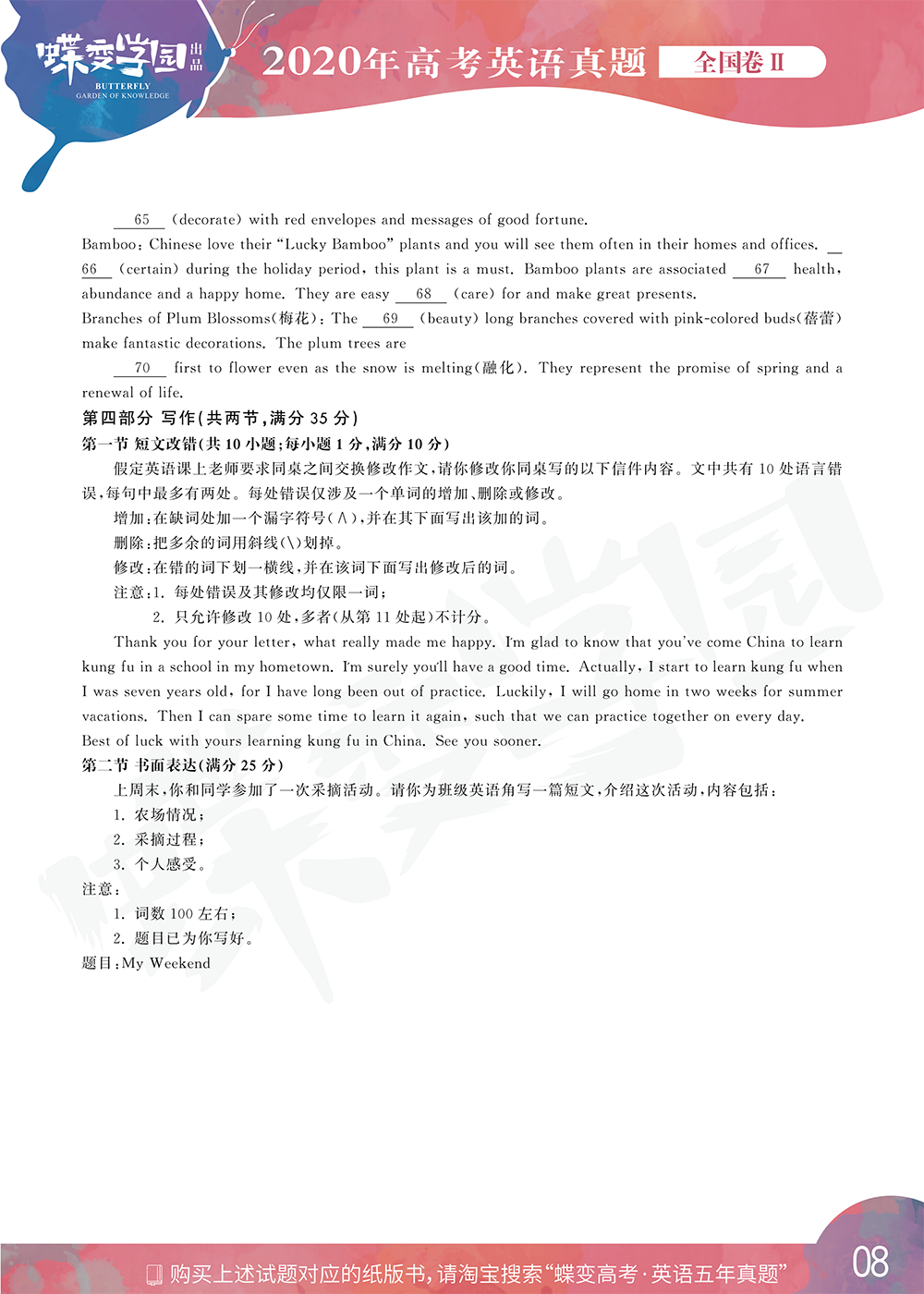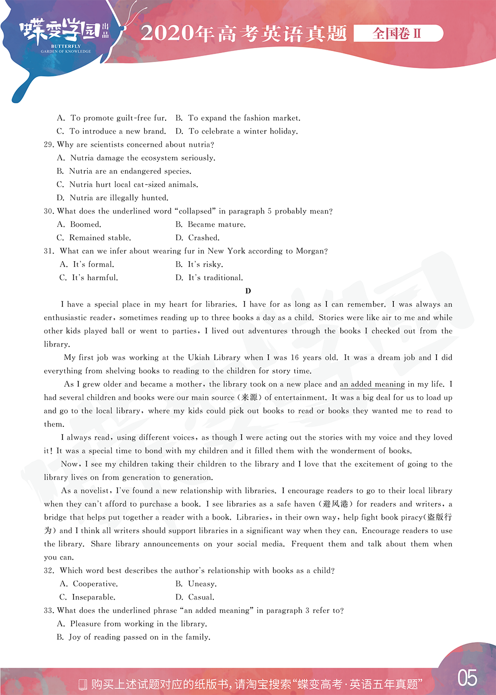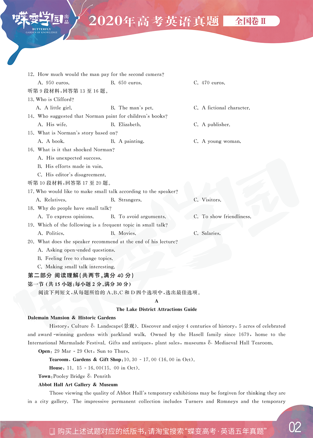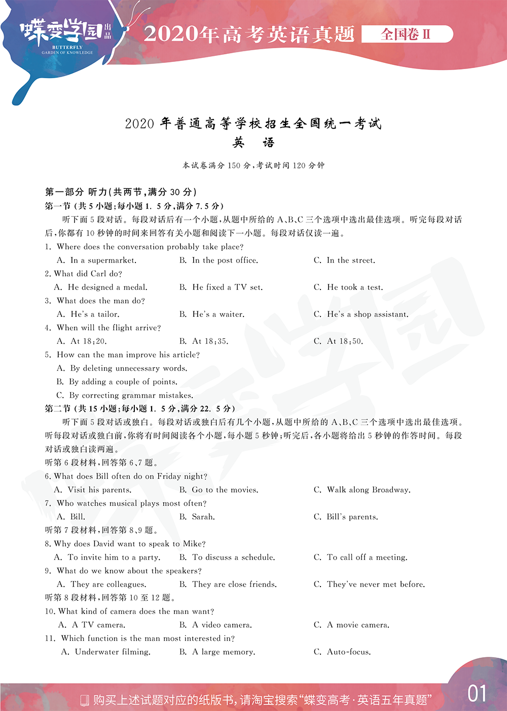 2020年全国2卷高考英语试题【高清精校版】 时间:2020-07-14 15:07 英语试题 本文档整理了【高清精校版】2020年全国2卷高考英语试题。点击文末的下载,可下载PDF格式的文件,便于打印和存储。