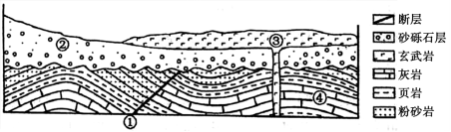 图3示意某地质剖面,其中①指断层。据此完成7~8题。