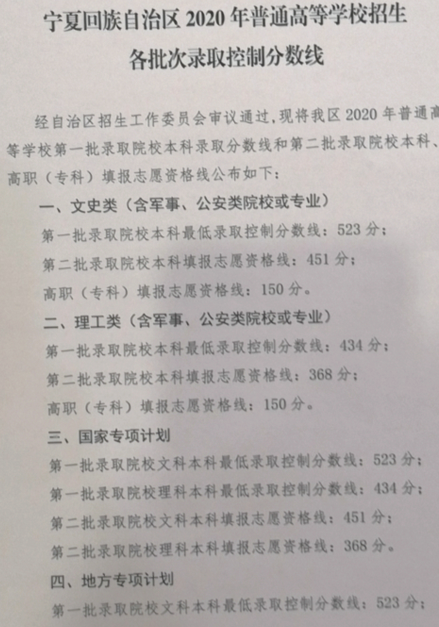 2020年宁夏高考录取分数线已经公布,想必同学们都已经迫不及待的想要知道今年宁夏的分数线是多少,以下就是小编整理的宁夏录取分数线,来看看吧。