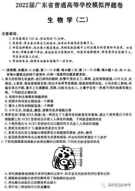 广东省2022届高三下学期普通高等学校模拟押题卷(二)生物试题...