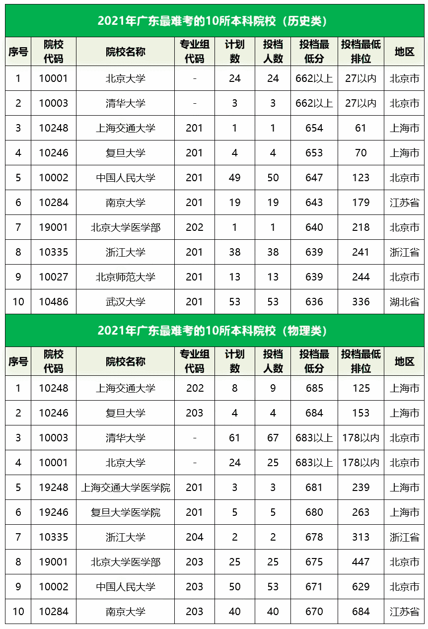 广东历史类最难考的10所大学有:北京大学、清华大学、上海交通大学、复旦大学、中国人民大学、南京大学、北京大学医学部、浙江...