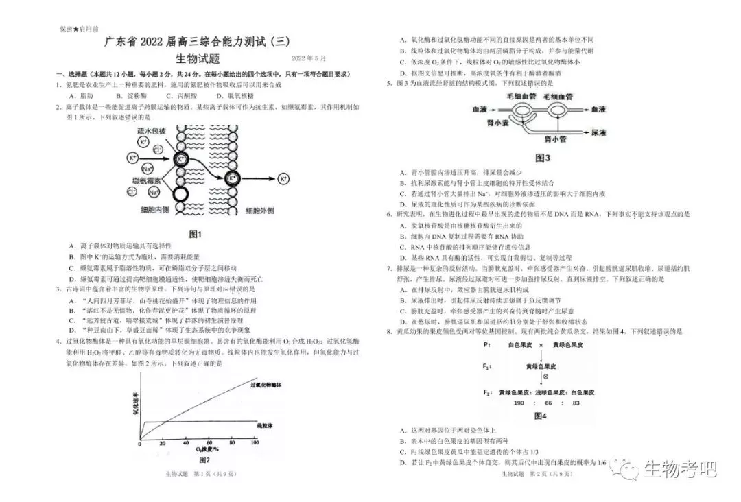 22-05-302022届广东省高三综合能力测试(三)生物试卷及答案