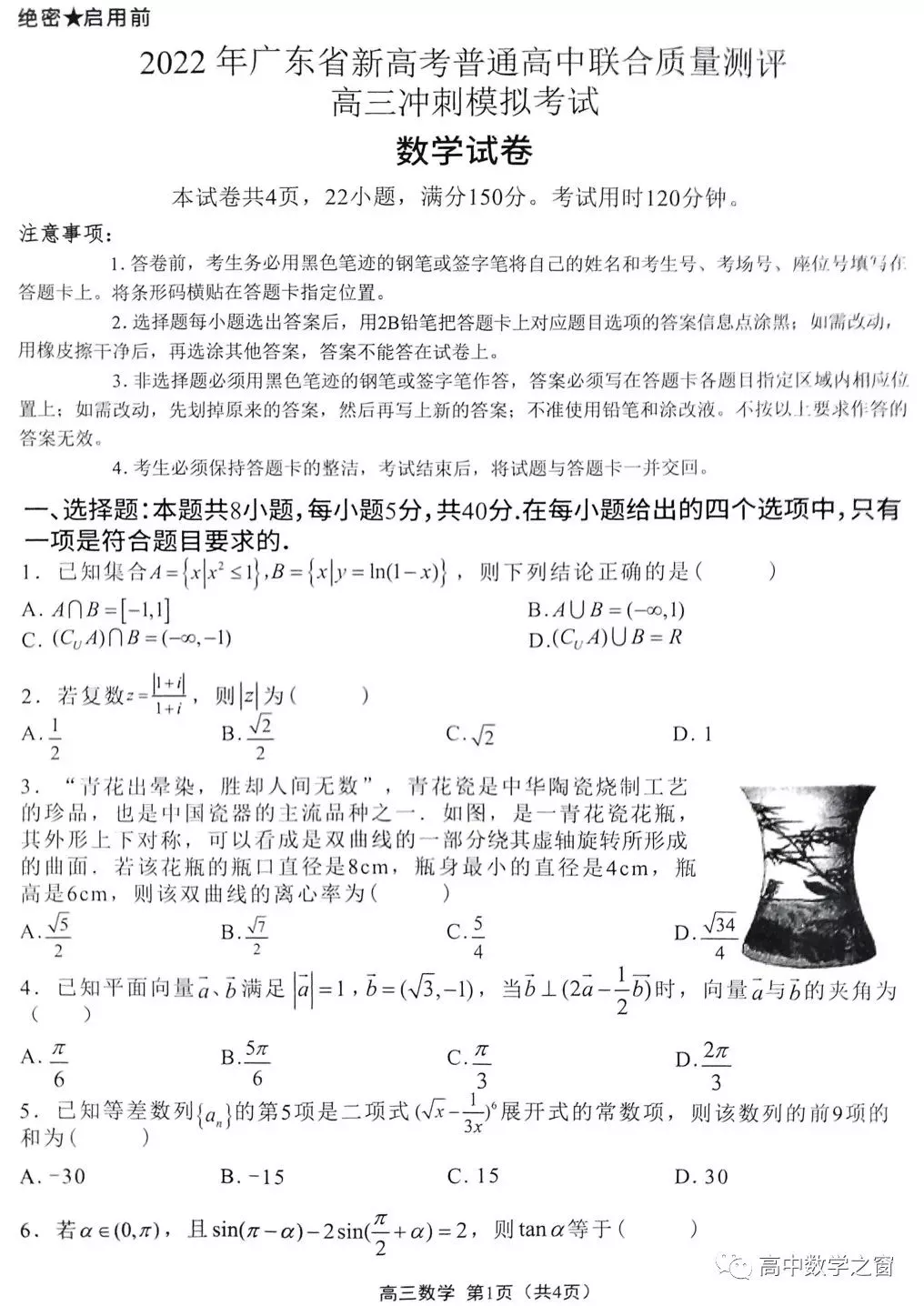 广东省2022年5月新高考质量测评高三冲刺数学试题及答案...