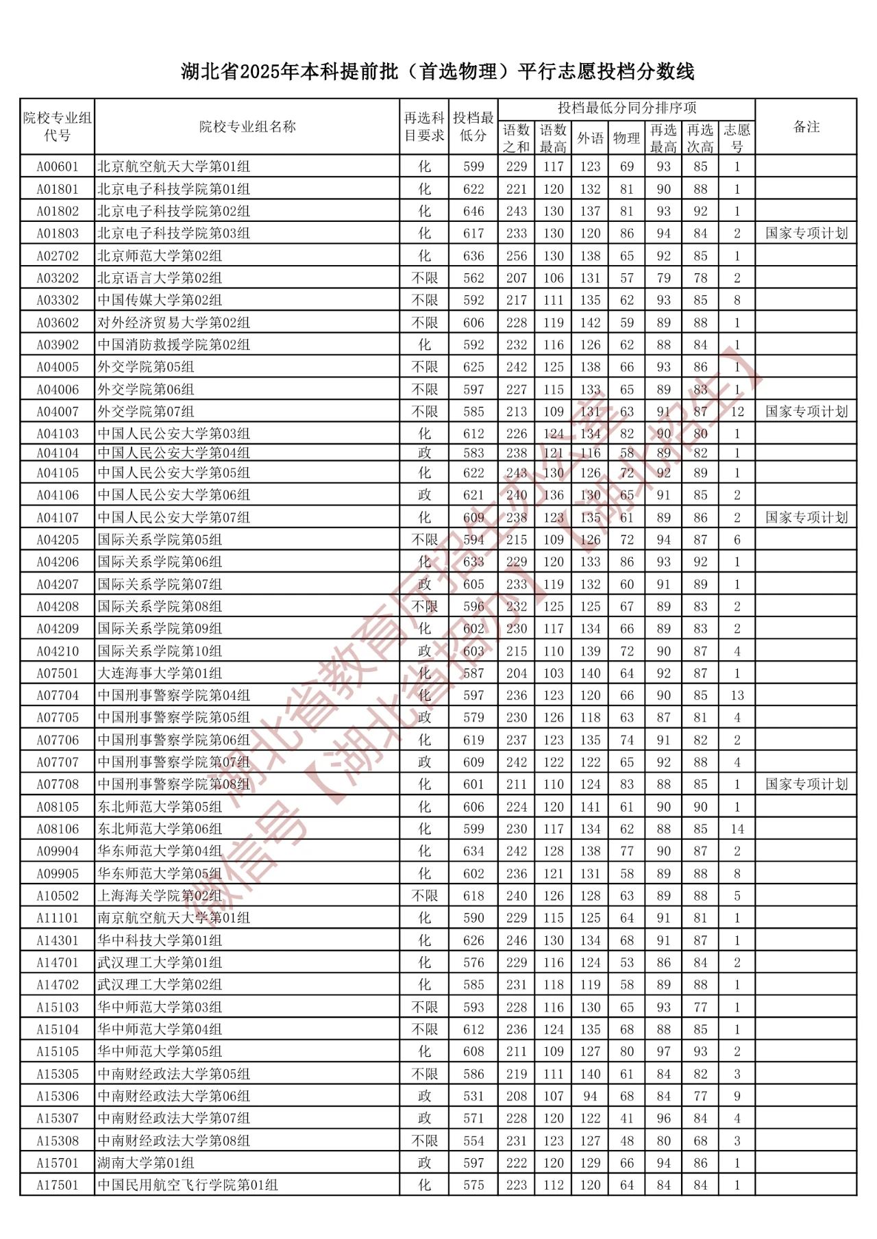 湖北省2025年本科提前批(首选物理)平行志愿投档分数线
