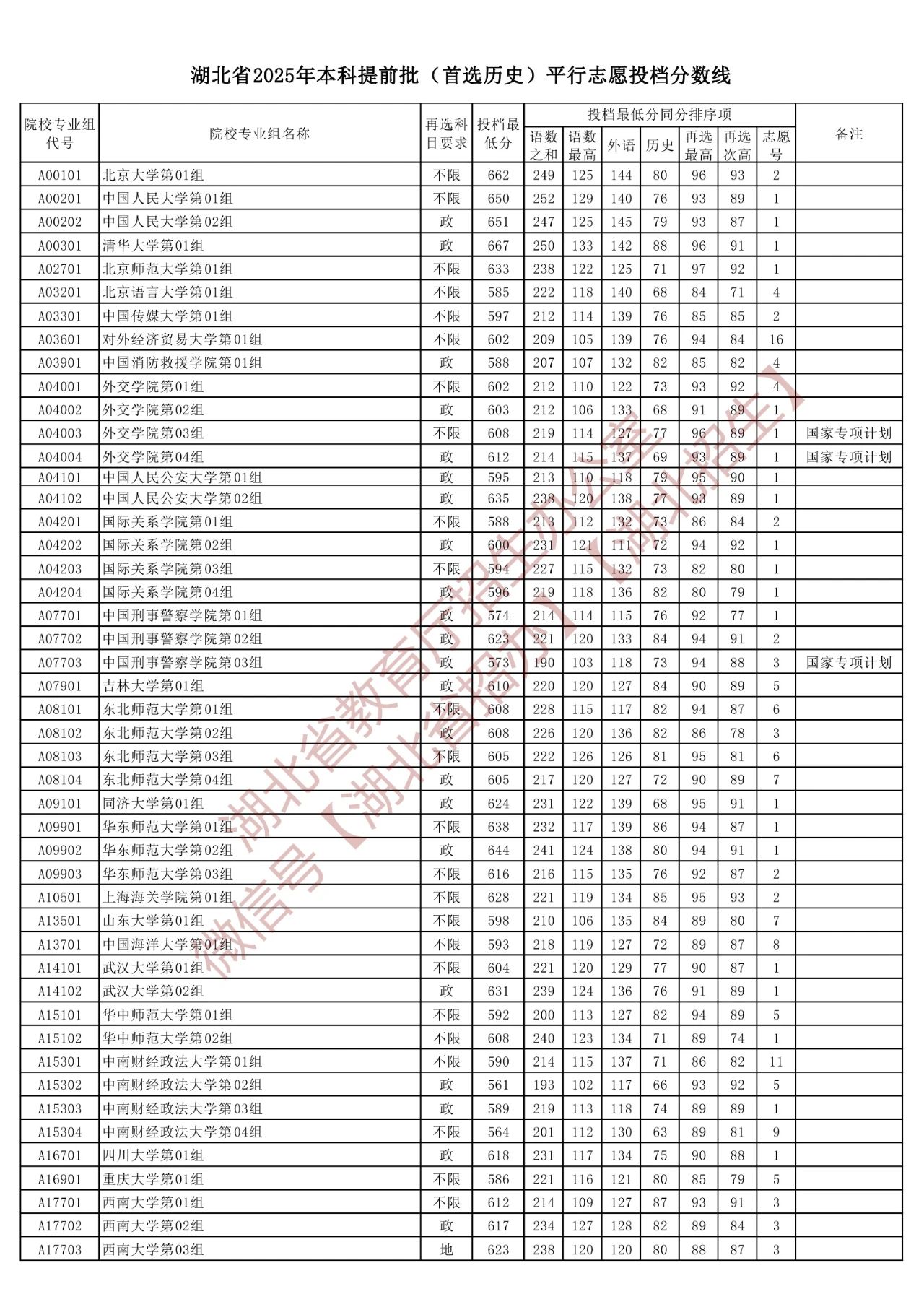 湖北省2025年本科提前批(首选历史)平行志愿投档分数线