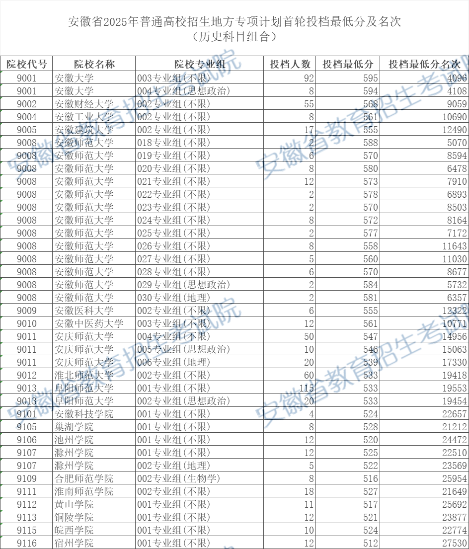 安徽省2025年普通高校招生地方专项计划首轮投档最低分及名次(历史科目组合)已发布,具体内容如下:...