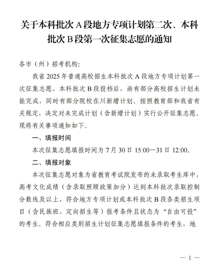 四川关于本科批次A段地方专项计划第二次、本科批次B段第一次征集志愿的通知已发布,具体内容如下: 附件: 1.2025...