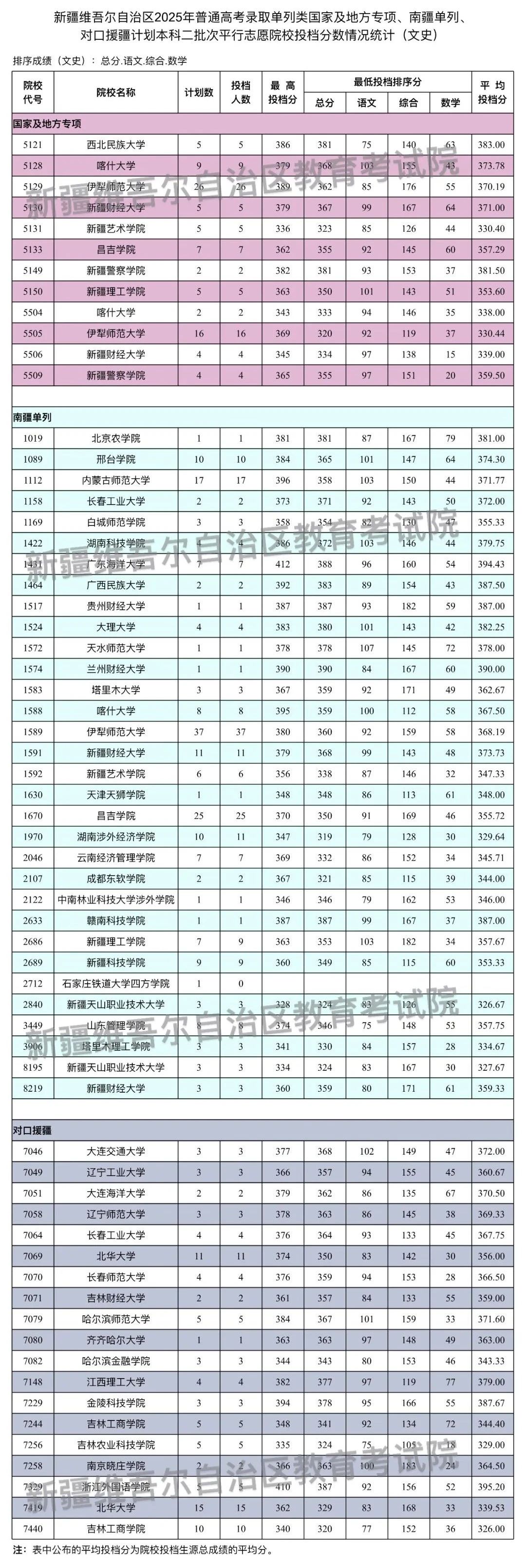 新疆维吾尔自治区2025年普通高校招生单列类国家及地方专项、南疆单列、对口援疆计划本科二批次投档情况