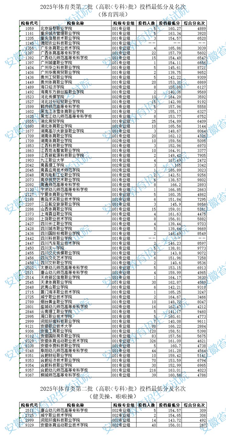 安徽2025年体育类第二批(高职<专科>批)投档最低分及名次已发布,具体内容如下:...