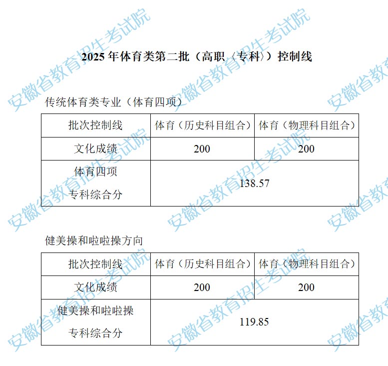 安徽2025年体育类第二批(高职〈专科〉)控制线已发布,具体内容如下:...